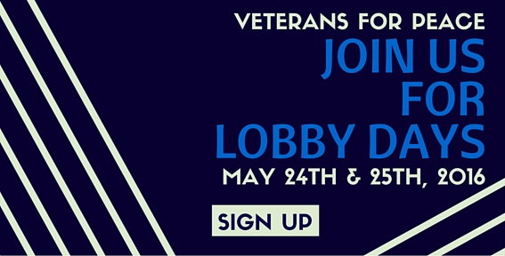 Lobby DaysThis year, Veterans For Peace Lobby Days are Tuesday and Wednesday, May 24th and 25th. Will you join us? The House and Senate are both in session that week, and we need your help! Don't underestimate the significance of your presence. We have secured a limited number of rooms at a low cost for members who are traveling to DC. Please sign up ASAP. We will follow up with you to plan housing accommodations. If you can’t come to D.C., you can ask local offices to arrange a conference call with the appropriate legislative aide in Washington. It is ideal to set these meetings up about a month ahead of time.