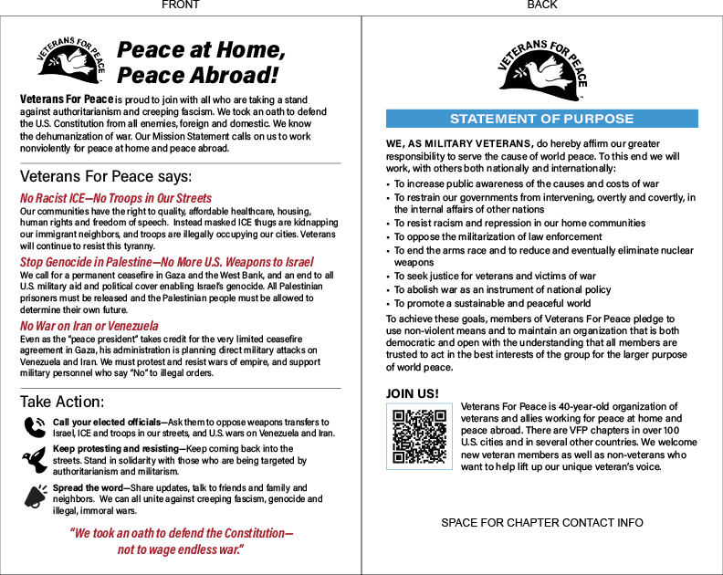 Below you will find two versions of the CCMP brochure. The full-color version can be sent to a local print shop for printing, and the simplified version was created for those who prefer to print at home. Click on the images below to access the file for download! You will also see the VFP Environmental Costs of War handout, as well as a half-page flyer that links to the full PDF!