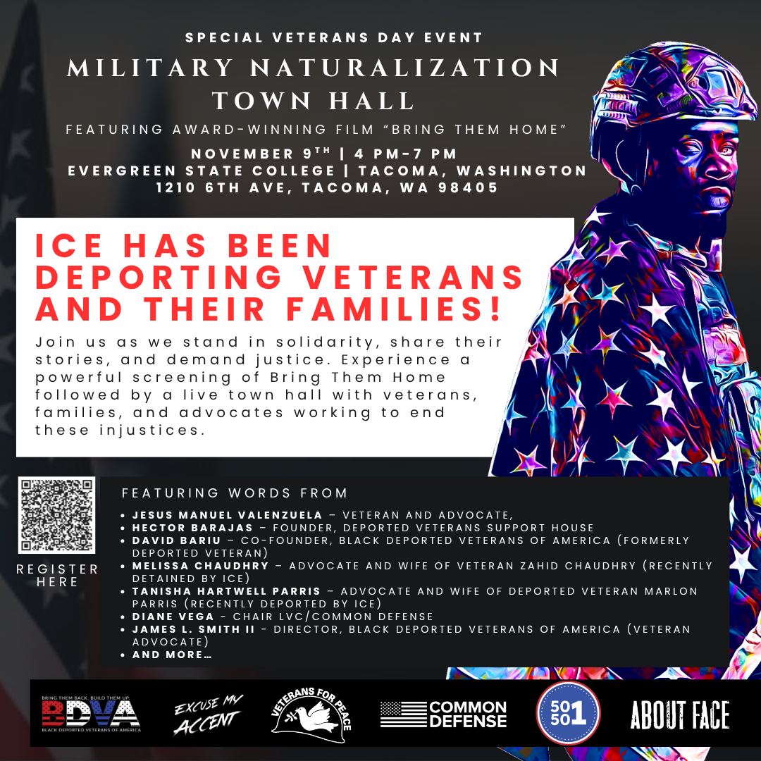 We would like to invite you to this groundbreaking town hall on Military Naturalization, DEPORTED VETERANS, and the effects that ICE raids are having on the military community. This in-person & virtual town hall will be completely focused on this issue, and this issue only. Too many times this subject is on an agenda, yet ultimately becomes a footnote.