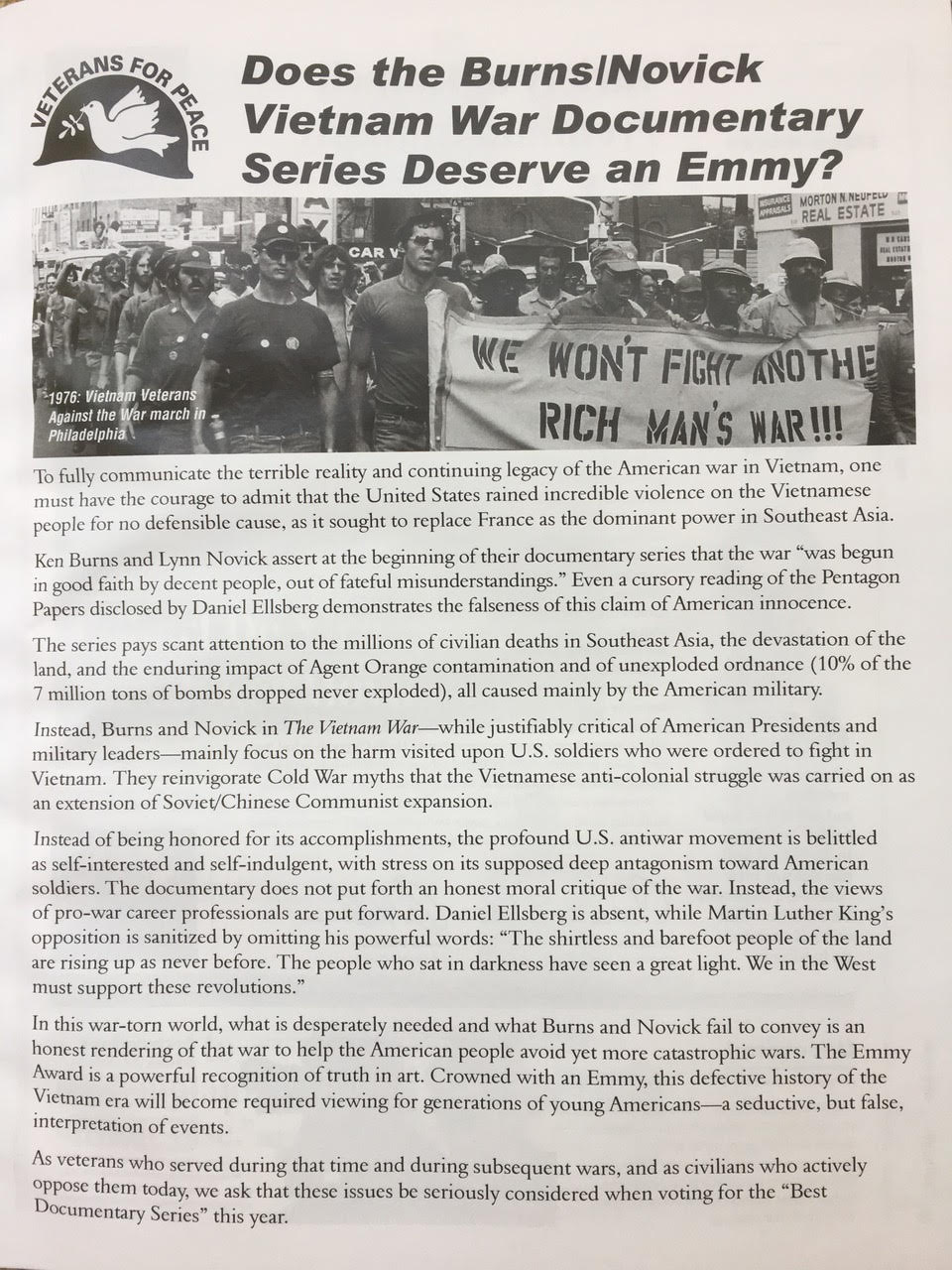 In the face of the attempted whitewashing of that war by the Pentagon, the Full Disclosure Campaign of Veterans For Peace is attempting to dissuade Hollywood from awarding the Burns/Novick an Emmy. Veterans For Peace were not silent about speaking out about the Koch Brothers and Bank of America-funded The Vietnam War documentary series by Ken Burns and Lynn Novick. Now with Burns and Novick’s misleading and less-than-honest documentary coming up for an Emmy, once more we are compelled to speak out.