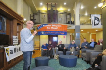 Associate members also spoke; Bart Haggin recalled his visit to the Hiroshima Memorial in Japan in detail, David Brookbank remembered growing up on military bases near runways and the threat that Fairchild Air Force Base brings to Spokane, and John Alder reflected upon the resources wasted on military adventurism. Watch the short video here.
