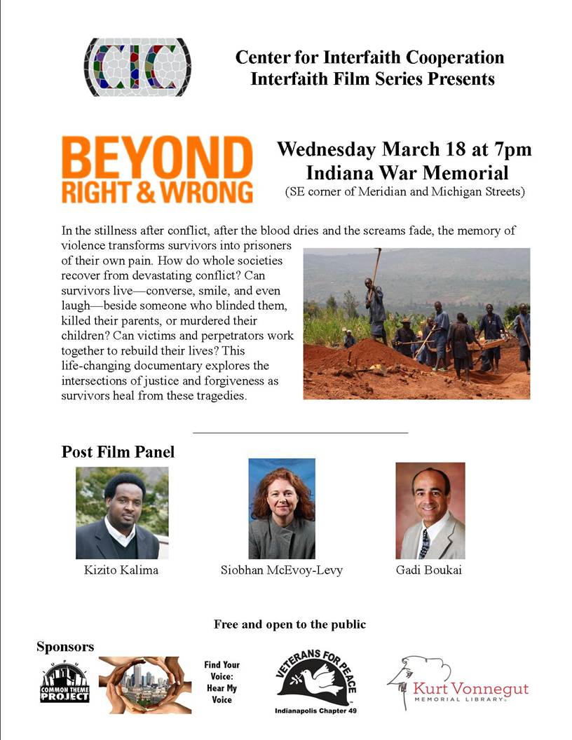 Our friends at the Center for Interfaith Cooperation, along with Veterans For Peace Chapter 49, the Vonnegut Memorial Library, and Common Theme Project, are sponsoring a showing of the film Beyond Right & Wrongon March 18, followed by a panel discussion with people who have had personal experience in the conflicts on which the film focuses. For more information on the film, see: Beyond Right & Wrong.
